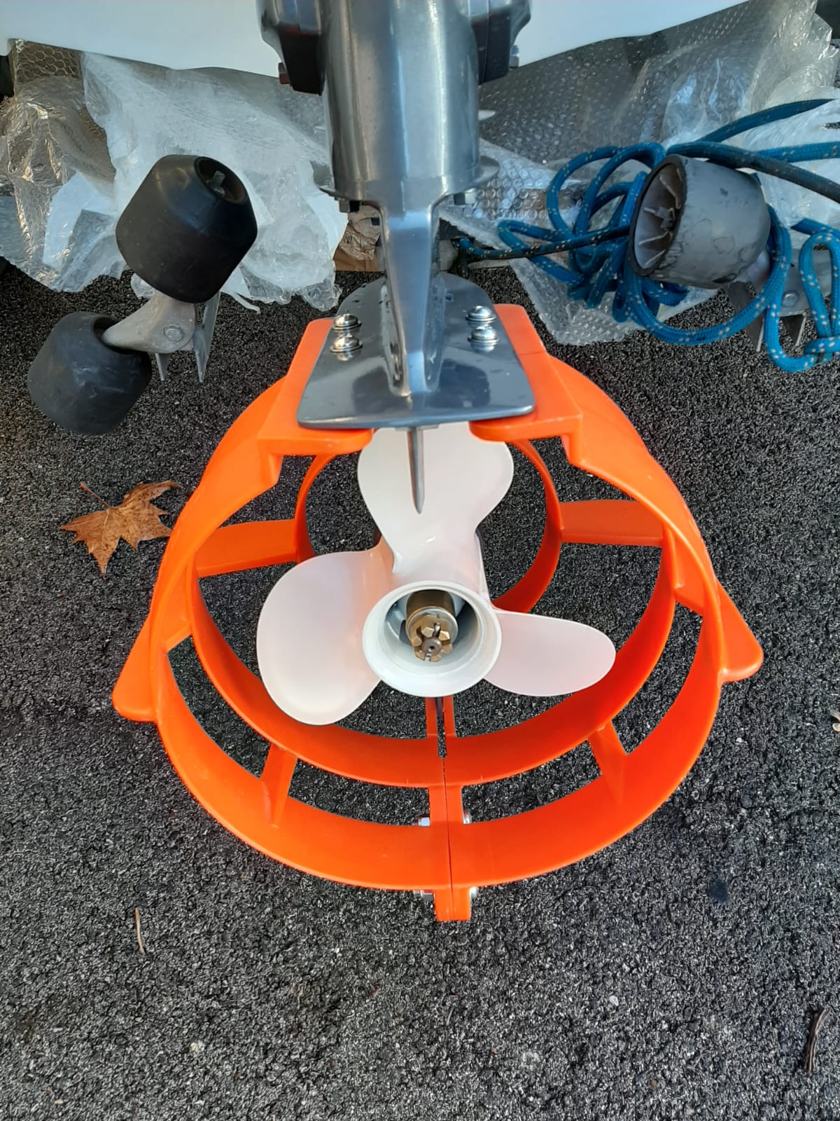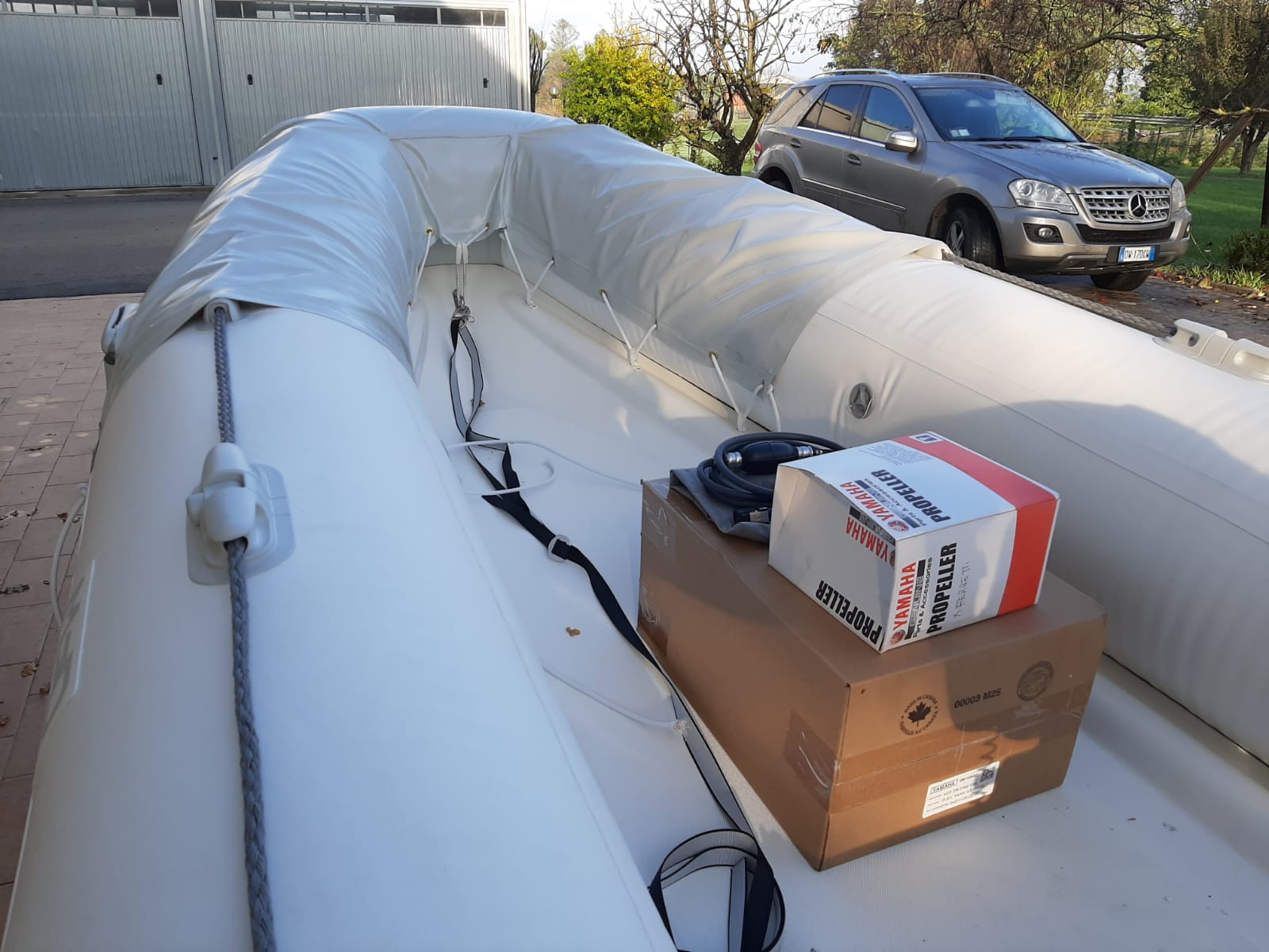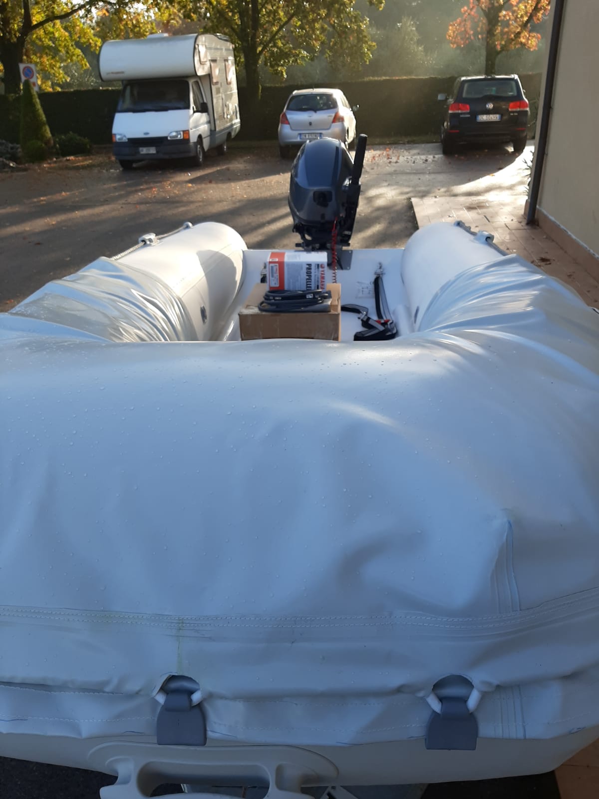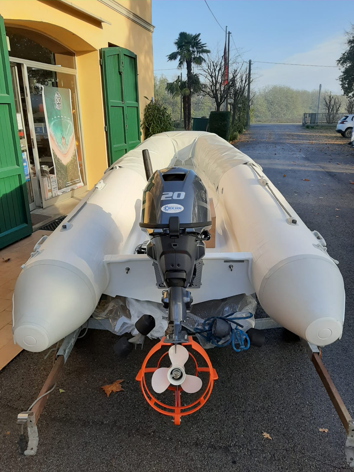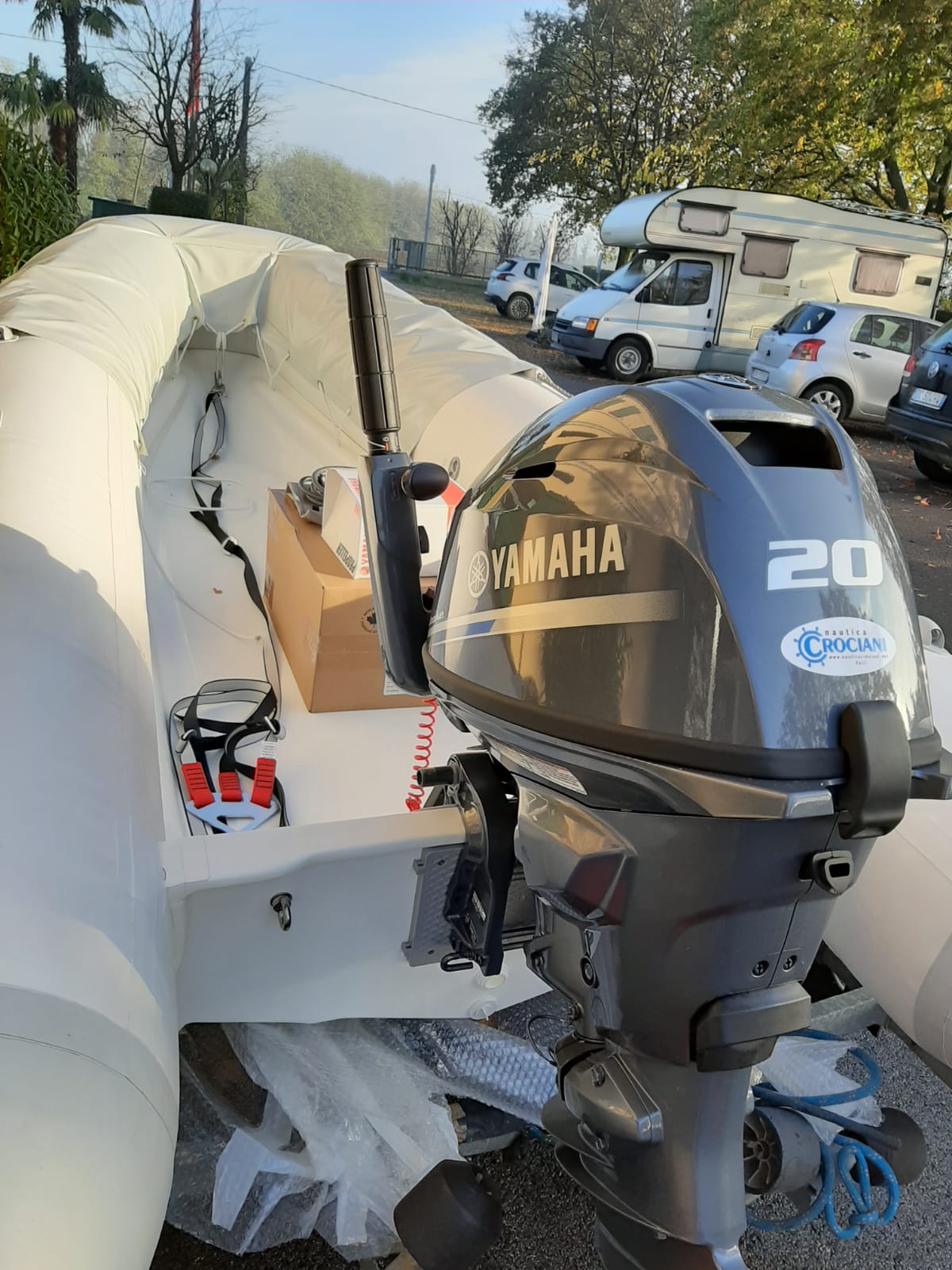 Tender ARIMAR-MED Easy Line 360 , motorizzato con Yamaha F20. Allestimento da lavoro con protezione elica motore e protezione tubolari anteriori. In consegna al Cantiere CRN_Ferretti di Ancona.