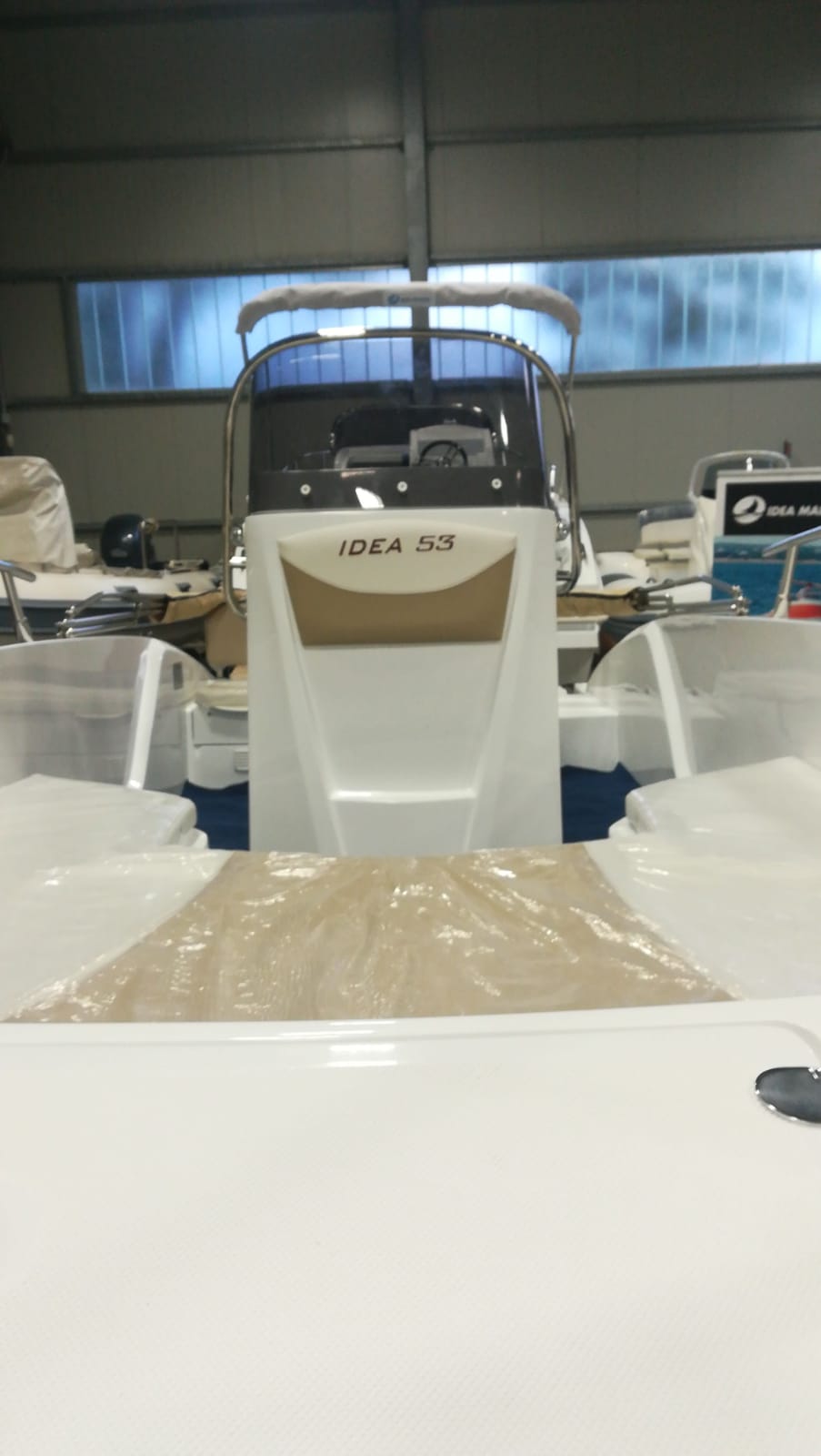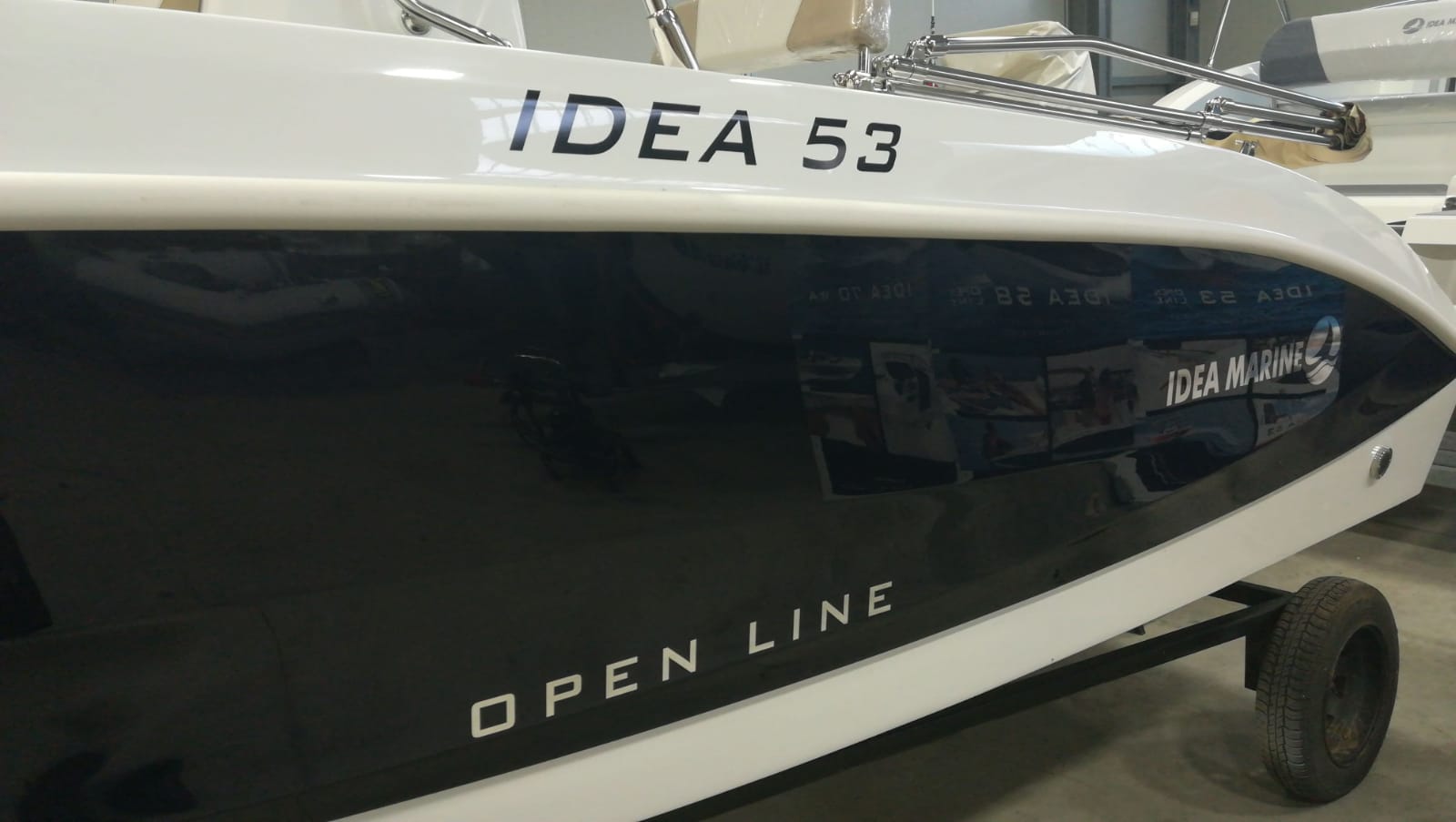 Natante Idea Marine 53 open completa di accessori standard + Tendalino parasole Inox, Pannello utenze elettriche, Colore fiancata Black-Blue. Motorizzata con motore Yamaha F40HETL (40/60) con strumento contagiri, elica alluminio, scatola comando laterale, installazione con 1 batteria.